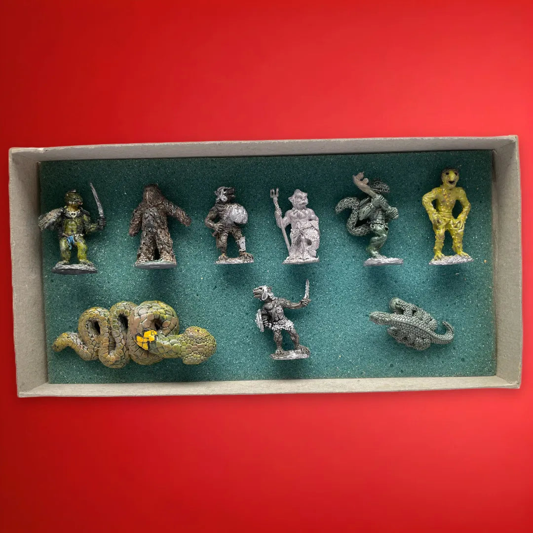 Denizens of the Swamp is a 25 mm metal AD&D miniatures set for Advanced Dungeons & Dragons, featuring 9 classic swamp‑dwelling monsters. It includes lizardfolk, giant reptiles, eerie bog creatures, and sinister humanoids suited for murky wilderness encounters.
