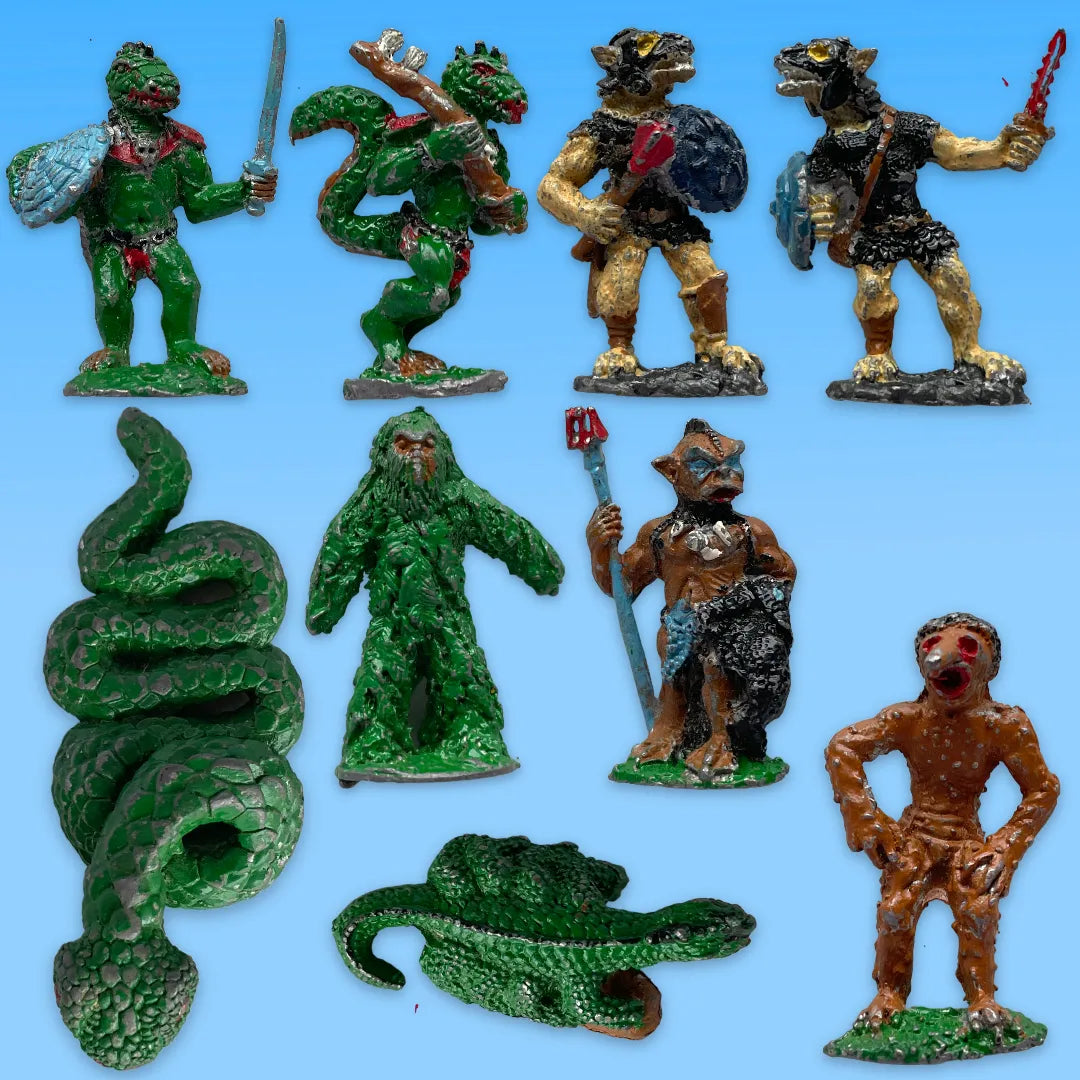 Denizens of the Swamp is a 25 mm metal AD&D miniatures set for Advanced Dungeons & Dragons, featuring 9 classic swamp‑dwelling monsters. It includes lizardfolk, giant reptiles, eerie bog creatures, and sinister humanoids suited for murky wilderness encounters.