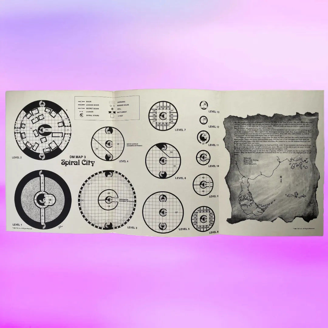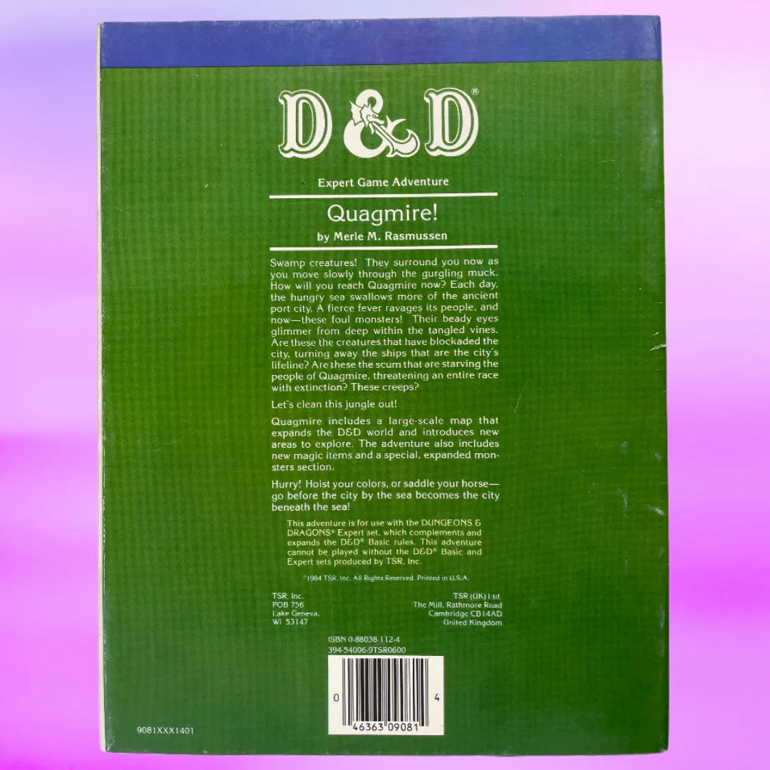 Quagmire! is a 1984 Expert-level Dungeons & Dragons adventure by Merle M. Rasmussen. Players journey through a monster-infested swamp to reach the spiral city of Quagmire, now sinking into the sea. The mission: liberate its people from lizard man oppressors and restore hope to the Serpent Peninsula.
