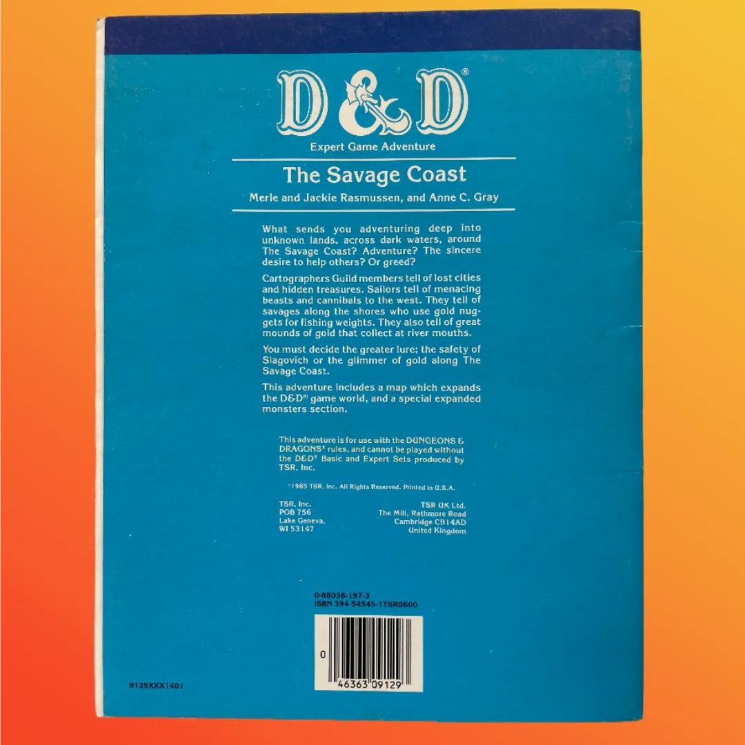 The Savage Coast is a 1985 Expert-level D&D adventure by Merle M. Rasmussen. Designed for characters levels 6–9, it sends players along a perilous frontier coastline filled with pirates, lost cities, and exotic cultures. Featuring wilderness exploration and naval encounters, it expands the Known World westward, introducing the Savage Coast region later developed in Mystara lore. It also includes hex-crawl mechanics and a detailed map of the region.